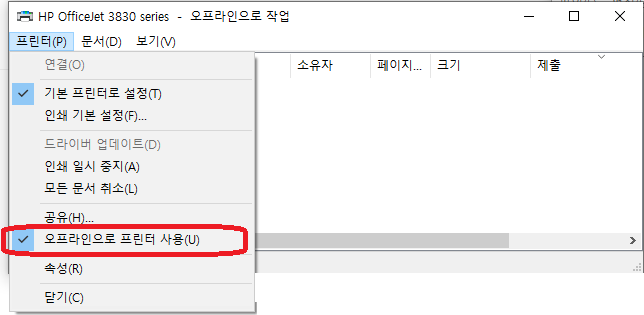 위의 사진처럼 오프라인으로 프린터 사용에 체크가 되어있다면