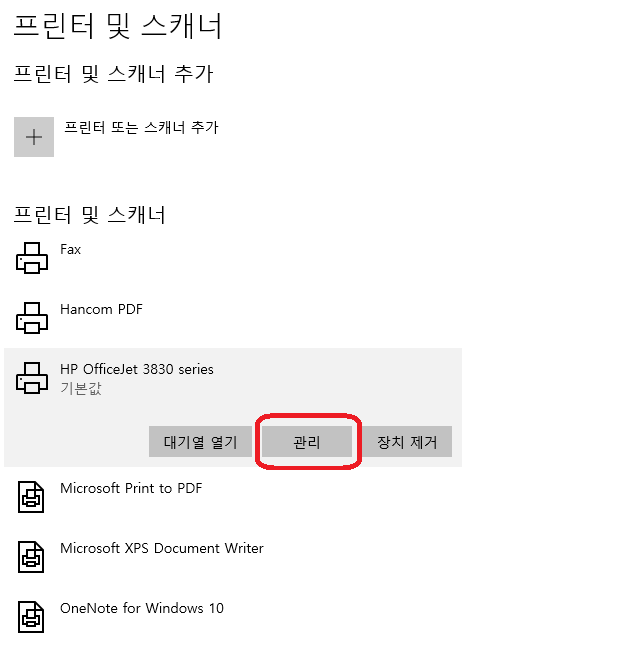 제어판의 프린터 및 스캐너 메뉴로 가서