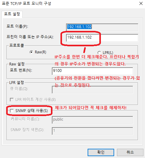 그 이후에 SNMP상태 사용에 체크가 되어있다면 꼭 체크를 해제하자!